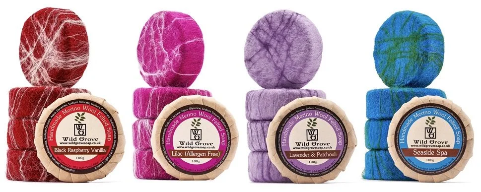 Colourful, soft, ethically sourced Merino wool is loosely wrapped around the naked soap, immersed in hot water and agitated using surface texture to allow the fibres to knit together. This creates a soft yet gently exfoliating wash pad that shrinks along with the soap and dries very well between uses, particularly if left outside of the shower stall.